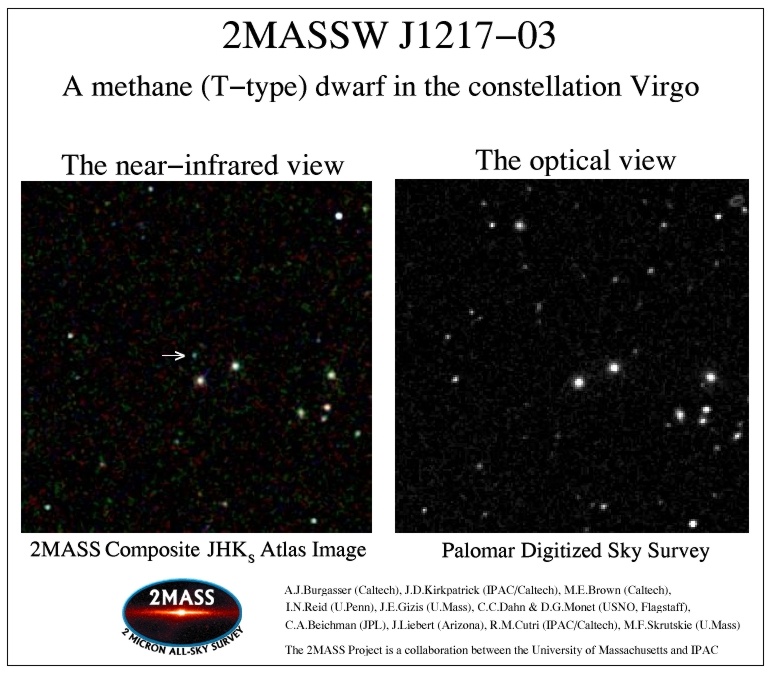 An example of one of the methane (T-type) dwarf discoveries. At left is a 5x5 arcminute piece of sky as seen in the near-infrared by the Two-Micron All-Sky Survey (2MASS). In the center of the frame, marked with an arrow, is the object known as 2MASSW J1217-03. On the right for comparison purposes is the same piece of sky seen in visible light. In this visible-light view, 2MASSW J1217-03 is not seen because it is at least 4000 times fainter here than in the near-infrared view.